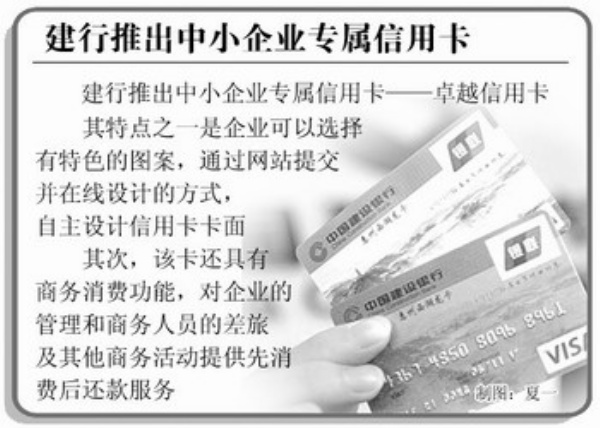 本报讯 日前中国建设银行在浙江省温州市推出了为中小企业打造的专属信用卡————卓越信用卡,这是建行运用先进的个性化制卡工艺,为企业形象和信用良好的优质企业提供自主卡面设计的团体专属信用卡,是国内信用卡领域的首创。 (谢婉婉)