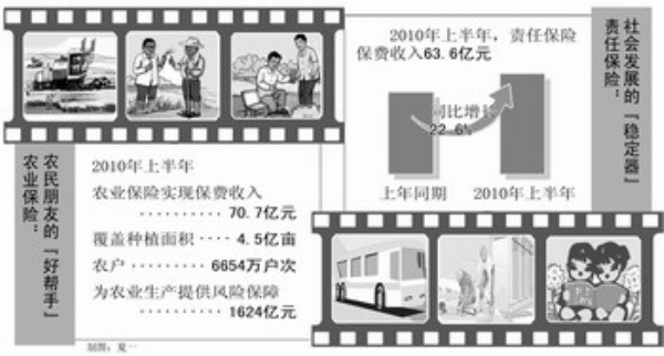 可喜的是,今年上半年全国各地保险业积极发展责任保险。江西省的拖拉机交强险在全省范围内深入推进,江西保监局加强与安监、质监等部门的合作,协调推进高危行业安全生产责任保险、特种设备责任险;青海保监业则大力发展承运人责任险、火灾公众责任险、校(园)方责任险等。
