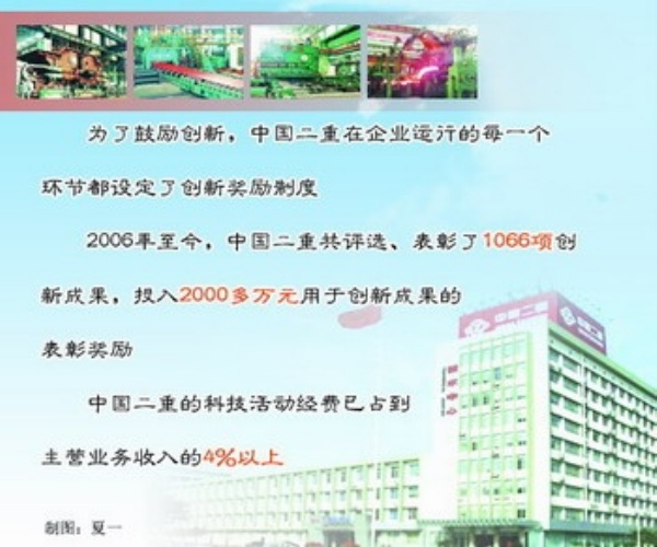 为了鼓励创新,中国二重在企业运行的每一个环节都设定了创新奖励制度。2006年至今,中国二重共评选、表彰了1066项创新成果,投入2000多万元用于创新成果的表彰奖励,在企业中形成了“鼓励创新,宽容失败”的良好氛围。“集团公司的科技活动经费,已经占到主营业务收入的4%以上。”汪福全介绍道。