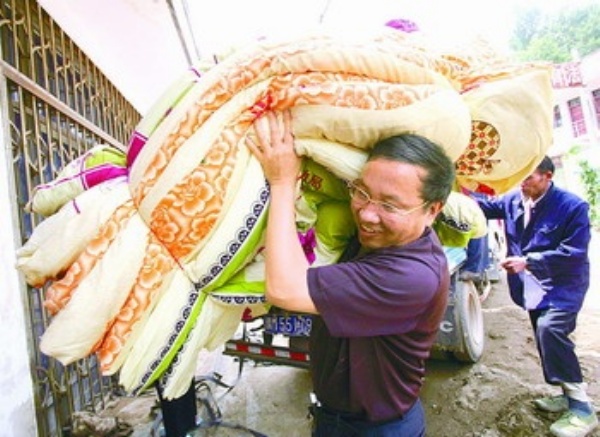 7月28日,河南省卢氏县狮子平乡的受灾群众领到民政部门送来的棉被。河南省豫西山区卢氏、栾川等地7月23日至25日普降暴雨、特大暴雨,当地乡村干部带领群众积极开展生产自救,抢修基础设施及抢收农作物,降低受灾造成的经济损失,尽快恢复生产生活。 杜 杰摄(新华社发)