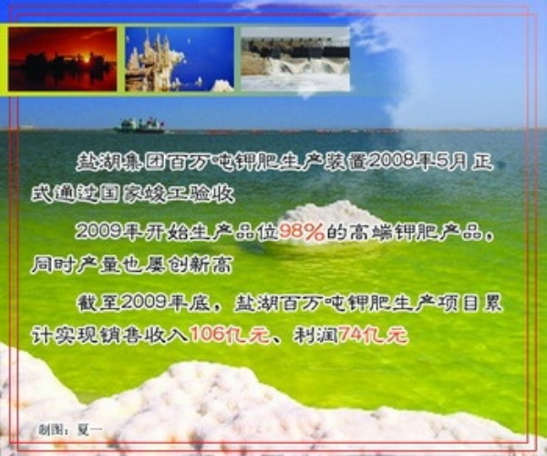 截至2009年底,盐湖集团百万吨钾肥生产项目累计实现销售收入106亿元、利润74亿元。这一期间,盐湖集团百万吨钾肥生产装置2008年5月正式通过国家竣工验收,2009年开始生产品位98%的高端钾肥产品,产量也屡创新高,今年可望突破116万吨。