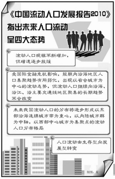 一是流动人口规模不断增加,但增速逐步放缓。报告显示,如果我国人口流动迁移政策没有大的变化,到2050年流动人口规模可达3.5亿人左右,但每年新增流动人口由560多万逐步下降到2050年的300万左右。二是受国际金融危机影响,短期内沿海地区人口集聚趋势有所弱化,出现以省会城市为中心的流动态势,但流动人口继续向沿海、沿江、沿主要交通线地区聚集的长期趋势不会改变。三是未来我国流动人口的分布将逐步形成以东部沿海连绵城市带为重心,以内陆城市群为中轴,以西部中心城市为集聚点的流动人口分布格局。四是人口流动由生存型向发展型转变。