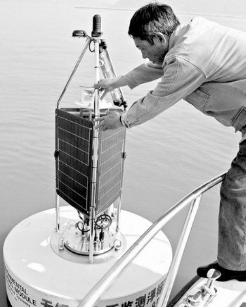 “这就是浮标式水质自动监测站。别看它个头不大,却密集着信息传感等多种技术。”无锡环境监测中心站站长丁建清说,它身上搭载水质监测仪,可迅速测出湖水的温度、电导、PH值、溶解氧、浊度、叶绿素、蓝绿藻等7项水质数据,实现对水质的实时监测;浮标上装有气象传感器,可以实时监测风向、风速、气压、温度等气象指标,两者结合,实现了对湖体水质、水文和气象等要素的全天候、全方位、立体式监测。浮标带有航标灯、GPS定位、雷达放射器和锚系等安全措施,将仪器实测的数据通过无线网络及时传送到控制中心。