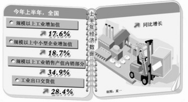 其中,中小企业运行态势明显改善。去年9月,《国务院关于进一步促进中小企业发展的若干意见》发布,从金融、财税等各方面提出了29条具体意见来完善中小企业发展环境,扶持中小企业健康发展。今年,在一系列促进中小企业发展政策措施的逐步落实下,中小企业经营状况进一步改善。上半年,全国规模以上中小型企业增加值同比增长18.7%,增速高于全国平均水平。