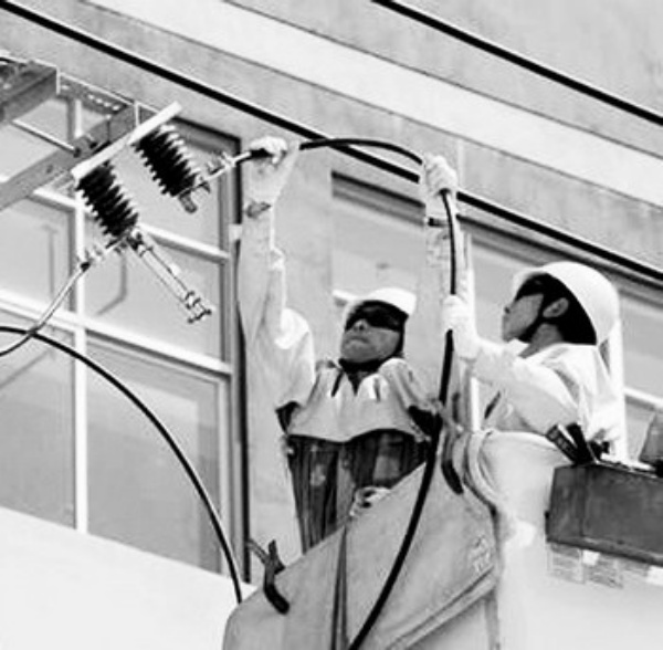 入夏以来,福建电网迎来用电高峰。为不影响客户用电,该网在辖区内全面推广带电作业。这是福州市电业局员工正冒着酷暑带电抢修设施故障。 本报记者 陈 煜摄