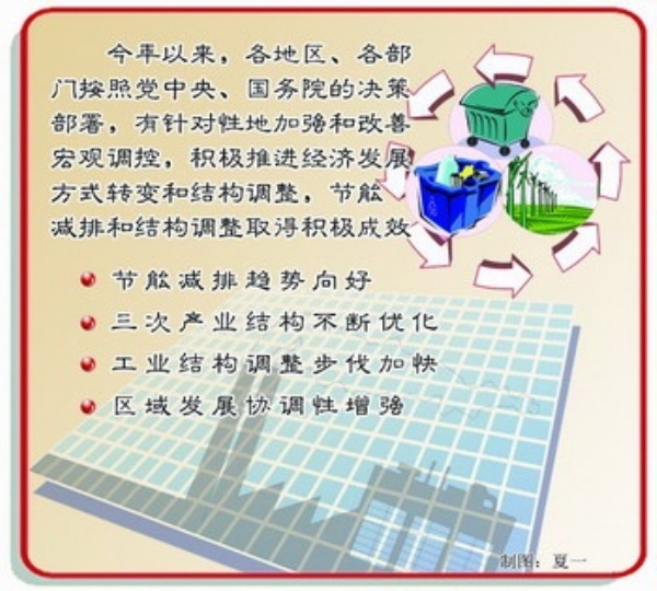 今年以来,各地区、各部门按照党中央、国务院的决策部署,有针对性地加强和改善宏观调控,积极推进加快经济发展方式转变,结构调整和节能减排工作取得积极成效。