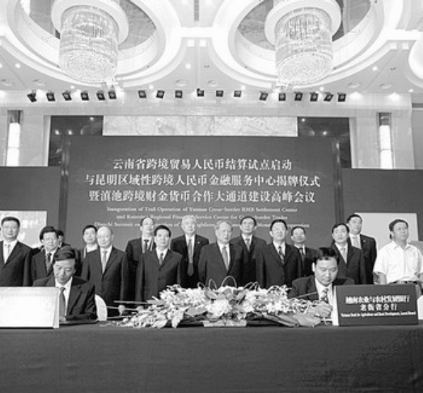 日前,在云南省跨境贸易人民币结算试点启动仪式上,中国农业银行云南省分行代表(左)与越南农业与农村发展银行老街省分行代表签署合作协议。云南的跨境贸易人民币结算试点,业务范围将涉及跨境货物贸易、服务贸易和其他经常项目人民币结算;不再限制境外地域,企业可按市场原则选择使用人民币结算等。 梁志强摄(新华社发)