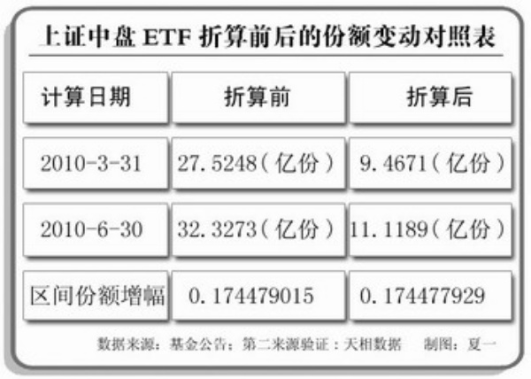 比如,二季度易方达上证中盘ETF的规模实际是增长17.45%的,但如果只按一季报和二季报公告的绝对数值计算而不经过数据处理,会得出该基金二季度规模变动为—59.6%,误差比较大。