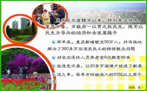 成为直辖市以来,特别是近两年,重庆市委、市政府一以贯之抓民生,探索以民生为导向的经济社会发展路子。两年来,重庆新增就业55万人,并有效地解决了360多万回流农民工的转移就业问题;对企业退休人员养老金6次提高标准;改造危旧房,让20多万困难户住进了新房;这几年,每年市财政收入的50%以上用于民生。