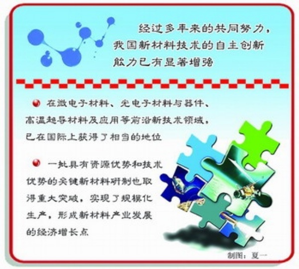 经过多年来的共同努力,我国新材料技术的自主创新能力已有了显著增强,例如在微电子材料、光电子材料与器件、高温超导材料及应用等前沿新技术领域,已在国际上获得了相当的地位。此外,我国一批具有资源优势和技术优势的关键新材料研制也取得重大突破,实现了规模化生产,包括超大规模集成电路配套材料、半导体照明材料与器件、低成本高能量锂离子电池等,形成了新材料产业发展的经济增长点。