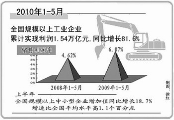 此外,内需拉动作用进一步增强,外贸出口加快恢复,也是上半年工业经济的重要特点。随着工业经济的复苏,上半年企业经营状况继续好转,中小企业运行态势改善。1—5月,全国规模以上工业企业累计实现利润1.54万亿元,同比增长81.6%,其中规模以上中小型企业实现利润同比增长72.2%。