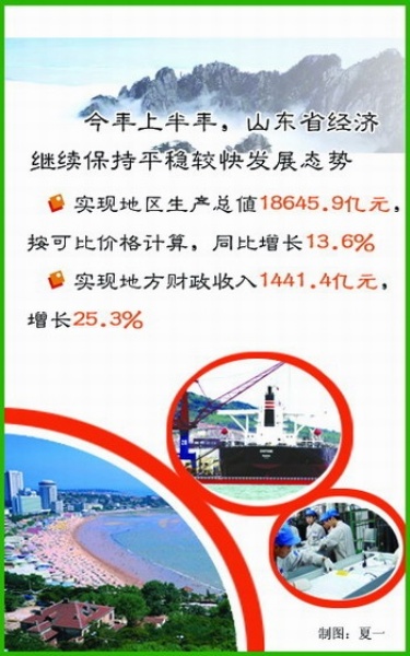 本报讯 记者单保江报道:今年上半年,山东省经济继续保持平稳较快发展态势。初步核算并经国家统计局核定,上半年全省实现地区生产总值18645.9亿元,按可比价格计算,同比增长13.6%,比上年同期提高3.6个百分点。其中,第一产业增加值1605.5亿元,增长3.1%;第二产业增加值10491.5亿元,增长14.7%;第三产业增加值6548.9亿元,增长14.1%。全省实现地方财政收入1441.4亿元,增长25.3%。