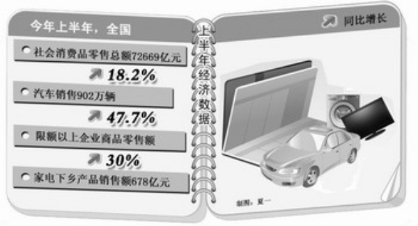 中高档商品需求回暖,消费结构升级继续加快。上半年我国家电、汽车消费政策效应进一步显现,热点商品持续旺销。全国汽车销售902万辆,增长47.7%;发放汽车以旧换新补贴资金24.2亿元,补贴车辆17.4万辆,拉动新车消费205亿元。家电下乡产品累计销售3251.8万台,销售额678亿元,分别是去年同期的2.4倍和3.2倍。此外,千家重点零售企业通讯器材类、金银珠宝分别增长14.9%、27.9%。