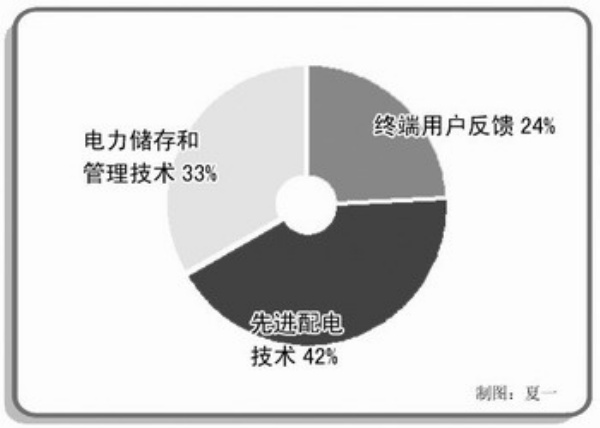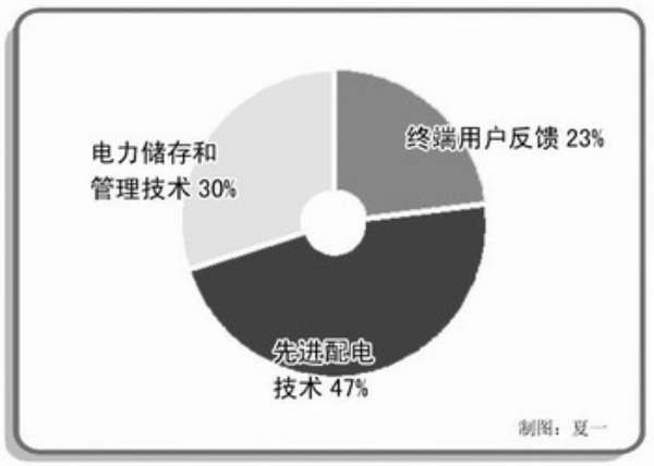 本次智能电网技术的统计主要有:先进配电技术,包括电力传输,例如超高压输电或超导输电;电力储存和管理技术,例如不间断供电、电能质量调整和动态电压恢复器等;以及终端用户反馈,例如需求侧管理、自动读数等技术。
