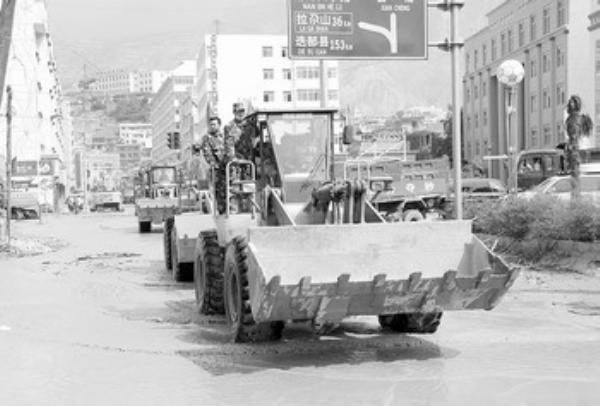 8月10日,消防官兵正在甘肃省舟曲县城清理被冲毁的街道。 本报记者 夏先清摄