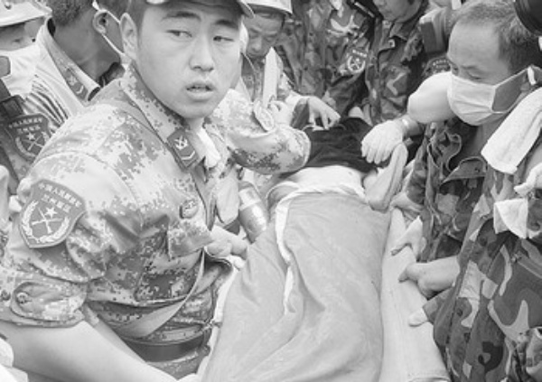 在一片废墟上,兰州军区某集团军邱少云部队炮兵团的战士们正在喊着口号把一段钢筋混凝土柱子奋力拉出,该团政治处主任刘宏伟告诉记者,据获救的群众讲,这里可能有6名群众被困在下面。“发扬抗震救灾精神,想尽办法要救人。人民子弟兵就要在人民群众最需要的时候冲锋在前。”刘宏伟一边指挥现场搜救,一边说。
