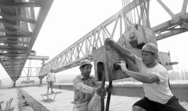 8月11日,长深高速公路山东临沂段王家庄大桥施工现场,工人正在箱梁安装作业。该段高速公路全长约144公里,计划2012年3月竣工。目前工程进展顺利,路基工程基本完成。 本报记者 赵 晶摄