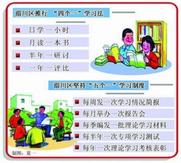 为了推动学习活动的开展,他们坚持“五个一”学习制度:每周发一次学习情况简报,每月举办一次报告会,每季编发一批理论学习材料,每半年一次专项学习测试,每年一次理论学习考核表彰。推行“四个一”学习法:日学一小时,月读一本书,半年一研讨,一年一评比。