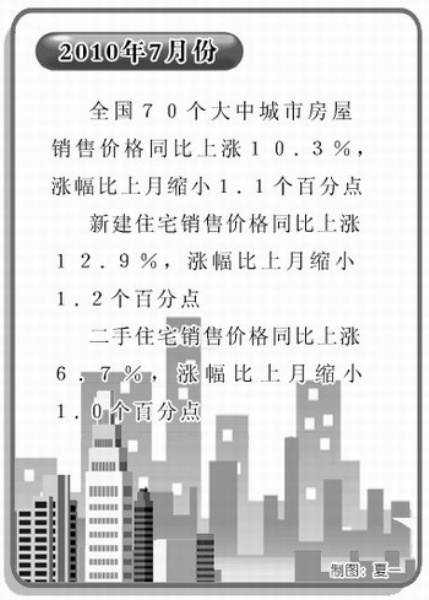 国家统计局的数据显示,7月份全国70个大中城市房屋销售价格同比上涨10.3%,涨幅比上月缩小1.1个百分点,环比与上月持平;新建住宅销售价格同比上涨12.9%,涨幅比上月缩小1.2个百分点,环比与上月持平;二手住宅销售价格同比上涨6.7%,涨幅比上月缩小1.0个百分点,环比下降0.1%,降幅比上月缩小0.2个百分点。