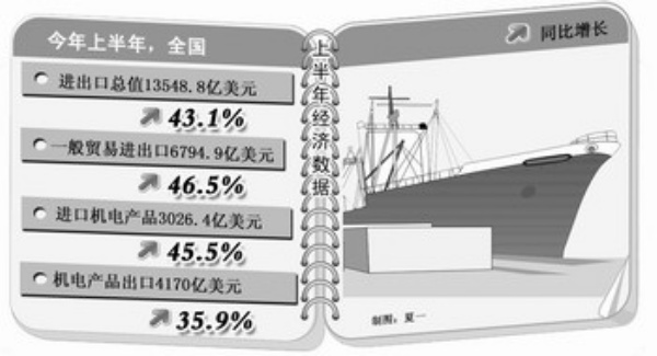 海关统计显示,今年上半年我国进出口总值13548.8亿美元,比去年同期增长43.1%。其中出口7050.9亿美元,增长35.2%;进口6497.9亿美元,增长52.7%;贸易顺差为553亿美元,下降42.5%。上半年我国一般贸易进出口增长迅速,机电产品出口保持快速增长。