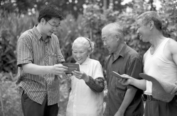 “我和老伴都超过60岁了,已经领了4个月的‘新农保’养老金,每月55元,我们一共领了440元。不用跑银行,也不上城关,干部亲自送到家门口,又方便又实惠,真没想到我们农民也能像城里人一样,能享受‘退休待遇’。” 邱道国兴奋地说,他已经动员了儿子、媳妇参保,只等他们回来就来填表办手续。
