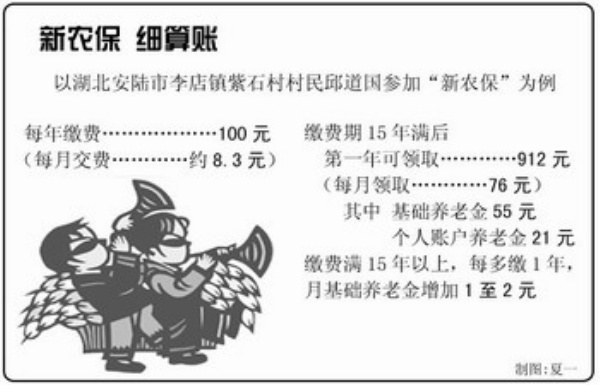 安陆是湖北13个“新农保”试点县市之一,今年元旦正式启动这项工作。该市专门制定了“新农保”暂行办法,成立了“新农保”管理中心,公安、金融、财政、计生、残联等部门和各乡镇、办事处密切协作,在信息采集、参保登记、基金收缴、待遇审核、特殊人群认证等方面共同为参保农民提供优质服务,从而调动了农民参保积极性。