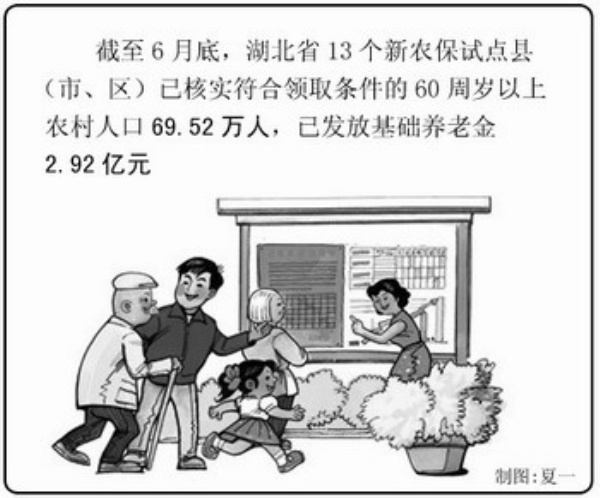 和宜都一样,其他的试点县(市、区)因地制宜制定方案,吸引鼓励农民参保。截至6月底,湖北省13个试点县(市、区)已核实符合领取条件的60周岁以上农村人口总数为69.52万人,已发放基础养老金2.92亿元;适龄参保人数347.36万人,已纳入“新农保”参保范围282.45万人,参保率达到74.6%。