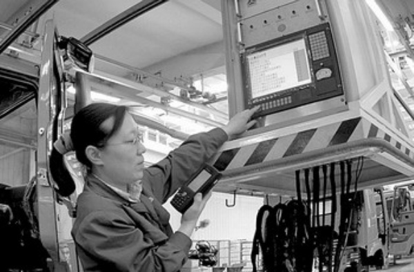 上图 重汽济南卡车公司运用先进技术,提高装配质量。图为内饰线女工正在使用“汽车电器智能检测仪”。 郭化南摄