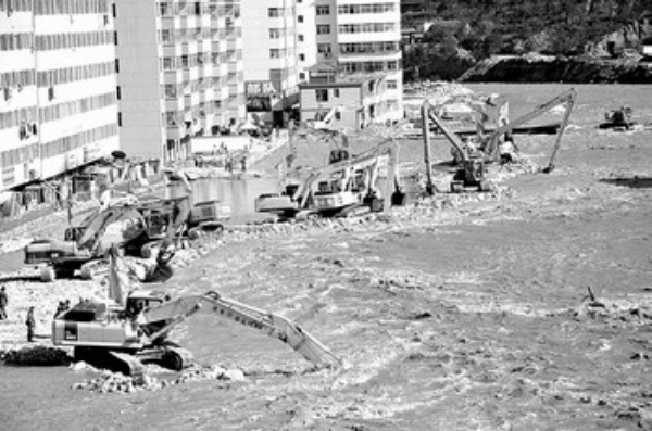 8月15日,武警水电部队30多台大型机械正在舟曲疏浚白龙江河道。 本报记者 李琛奇摄