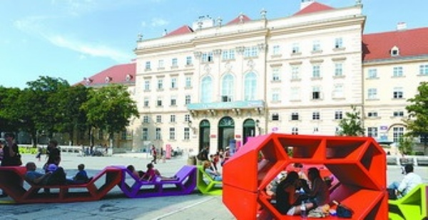 在维也纳市中心的博物馆区,一批意大利产的新式露天彩色家具日前正式取代之前的露天家具,为前来参观的市民和游客提供休息的地方。据介绍,这一批名为“Enzos”的新式家具采用了新材料和镂空造型,与它们的前辈“Enzis”相比,新的“Enzos”更轻、更坚固、更便宜,防火性能更加突出。Enzos还可以通过在内部注水使其放置更稳。图为在奥地利维也纳博物馆区,游客们在新式