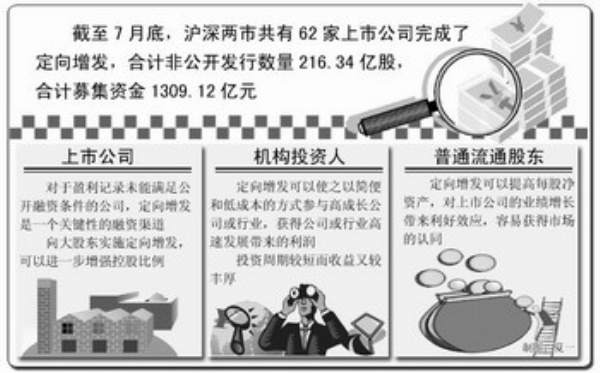 据市场研究机构统计,截至7月底,沪深两市今年以来已有超过200家公司发布非公开增发再融资公告,其中共有62家上市公司完成了定向增发,合计非公开发行数量216.34亿股,合计募集资金1309.12亿元,已经超过2008年全年定向增发融资总额1752.35亿元的74%。