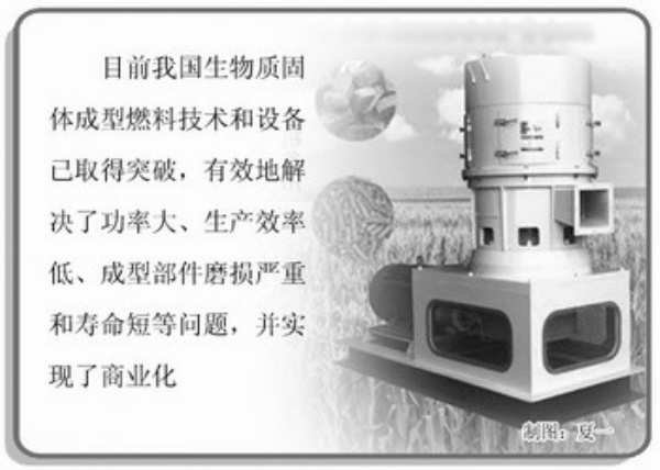 中国生物质固体成型燃料技术的研究开发已有20多年的历史。目前,中国生物质固体成型燃料设备的生产和应用已初步形成了一定的规模,生物质固体成型燃料设备在中国有不少厂家进行批量生产和市场化。秸秆固体成型燃料技术生产工艺、设备简单,易于操作,成本较低,加工生产的固体成型燃料热效率高,燃烧性能好,便于贮运,易于实现产业化生产和大规模使用,可满足农村居民炊事、取暖用能需求,可为城镇社区区域供热提供清洁燃料,还可用于蔬菜瓜果温室大棚和园林花卉暖房保温取暖用能,替代煤炭。2008年财政部出台《关于印发〈秸秆能源化利用补助资金管理暂行办法〉的通知》,明确重点支持秸秆固体成型燃料产业化发展。截至2009年底,全国年产生物质固体成型燃料近76万吨,初步具备了产业化发展条件。