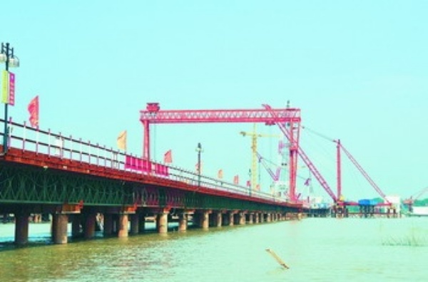 安庆长江铁路大桥工地(8月17日摄)。截至本月中旬,安徽省境内的安庆长江铁路大桥工程已提前完成过半。安庆长江铁路大桥是宁安城际铁路和阜阳至景德镇铁路的重要组成部分,全长2996.8米,主跨达580米。大桥自2009年3月20日开工建设,已用计划工期的三分之一完成约58%的工程量。 新华社记者 许逆之摄