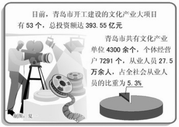 青岛市坚持把加快文化产业发展作为转方式、调结构的重要内容,作为建设高端产业聚集区的应有之义,像抓重大经济项目一样抓文化产业项目,积极推进龙头企业、产业基地(园区)和产业品牌建设,大力推动文化产业又好又快发展。青岛市采取资源整合、结构调整、跨地区经营、引进资本等方式,重点培育了10大龙头文化企业和100家重点文化企业,使其成为文化市场的主导力量。先后形成了青岛日报报业集团、青岛出版集团、青岛新华书店集团、青岛有线网络集团等6大国有文化企业。在此基础上,立足区位优势,重点发展优势和新兴文化产业,逐渐培育和形成了影视传媒、文化产品研发制造、出版发行印刷、文化创意、动漫游戏等八大滨海优势文化产业,增速年均达到21%以上,逐渐成为全市文化产业的主导性产业。目前,全市共有文化产业单位4300余个,个体经营户7291个,从业人员27.5万余人,占全社会从业人员的比重为5.3%。