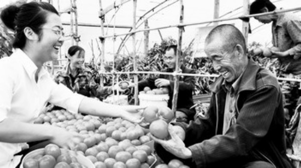 8月4日,甘肃皋兰县中心乡农技中心技术员张涛(左一),正在帮钱家窑村番茄产业示范户采收成熟的番茄。 从今年开始,皋兰县政府首次为辖区53个新农村和重点产业村每村选聘1至2名“田秀才”,负责帮助农民解决日常生产中的技术难题,由此实现了“县有中心、乡(镇)有站、村有技术员”的农技推广服务体系目标。 本报记者 李琛奇 通讯员魏周延摄影报道