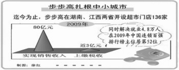 故事的主角是步步高商业连锁股份有限公司,一家从湖南小城湘潭起步的民营超市。15年来,它没有选择与大型现代商业企业和外资超市在大城市比拼,而是从湘潭起步,向湖南、江西的二三线城市扩张。靠着二三线城市巨大消费需求的滋养,快速生长,连续多年跻身中国连锁百强,锻造出了自己的核心竞争力。