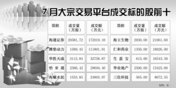 事实上,7月大宗交易成交榜前四名都超过6月头名,这也是大宗交易放出今年以来最大量的原因。自海通证券以下,潍柴动力成交11.18亿元,华胜天成成交3.27亿元,怡亚通成交2.97亿元。