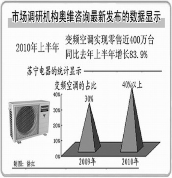 变频空调发展的步伐因此开始加快。市场调研机构奥维咨询最新发布的数据显示,2010年上半年变频空调实现零售近400万台,同比去年上半年增长83.9%,远远超出行业整体增长水平。苏宁电器的统计也显示,今年变频空调的占比达40%以上,而去年同期的占比在30%左右。