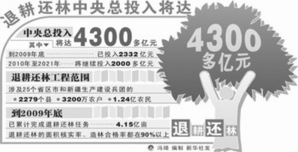 本报北京8月18日讯 记者刘惠兰从今天举行的国新办新闻吹风会上获悉:根据现有退耕还林政策标准和已完成任务测算,退耕还林中央总投入将达4300多亿元,其中到2009年底中央已投入2332亿元,2010年至2021年中央还将继续投入2000多亿元。