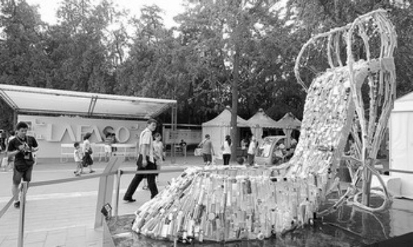 8月16日,由1000余只废弃化妆品瓶子制成的环保主题艺术品———“高跟鞋”在地坛公园亮相。 当日,“国际灯光作品秀”、“城市艺术生活国际创意市集”、“无限星空音乐节”、“夏季剧集盛宴”和“快乐动漫夏令营”5大板块内容构成的“创意点亮北京”文化艺术周活动在北京地坛公园开幕。赏灯、淘货、听音乐、玩动漫、看大片,体味创意魅力,乐享时尚生活是本次文