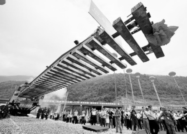8月18日,铺轨机在宜万铁路恩施段铺设最后一段铁轨。 新华社记者 郝同前摄