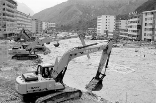 上图 8月17日,武警水电部队二总队官兵操作挖掘机在甘肃舟曲县城白龙江堰塞湖排险。