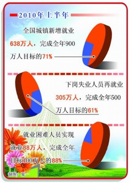据人力资源和社会保障部统计,今年上半年,全国城镇新增就业638万人,完成全年900万人目标的71%;全国下岗失业人员再就业305万人,完成全年500万人目标的61%;就业困难人员实现就业88万人,完成全年目标100万人的88%。