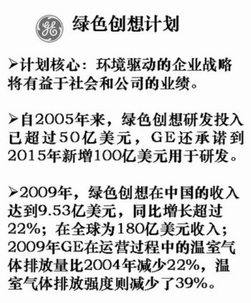 截至2009年底,通用电气“绿色创想”研发投入已超过50亿美元,提前一年达到预定目标。在2009年,具有节能环保优势的产品及解决方案为通用电气带来180亿美元收入,公司在运营过程中的温室气体排放量比2004年的基准线减少22%,温室气体排放强度则比2004年减少了39%。公司董事长兼首席执行官杰夫·伊梅尔特对此成绩评价认为,“绿色创想”是GE最成功的跨业务、跨行业战略之一。“绿色创想”2009年的收入可在财富排行榜上排在130位,增长速度相当于其他公司平均增长速度的两倍。此外,公司在“绿色创想”的研发项目上的大胆投入,也为股东带来了丰厚的回报。负责“绿色创想”的公司副总裁史蒂夫·福莱德认为,“绿色创想”的收入和研发投入每年都有所增加,经济困难时期也不例外。清洁、经济、安全、惠及全球的能源基础设施愿景一直激励和鼓舞着公司不断前行。GE将加倍兑现承诺,继续引领行业变革,并在未来5年将研发投入增至两倍。