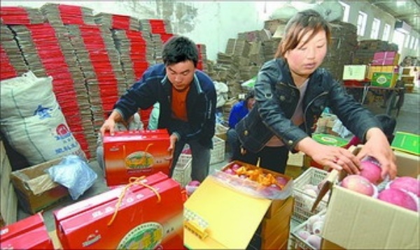 图2:平凉市静宁县果品经销公司的职工正在对出口苹果进行分级装箱。近年来,平凉市依托科技提升果品质量,通过实施绿色标准化生产,打造出“平凉金果”品牌,果产业已成为农民增收致富的特色优势产业。