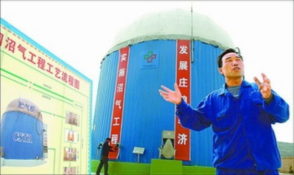 图6:平凉市庄浪县朱店镇金锁生猪养殖公司的职工在介绍“猪粪—沼气—发电”循环利用情况。农村沼气建设已成为该市发展循环农业,实现农业可持续发展的重要载体。