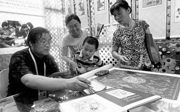 图2:7月18日,上海世博会湖北周上,民间艺人池福新(左一)向游客介绍孝感雕花剪纸。