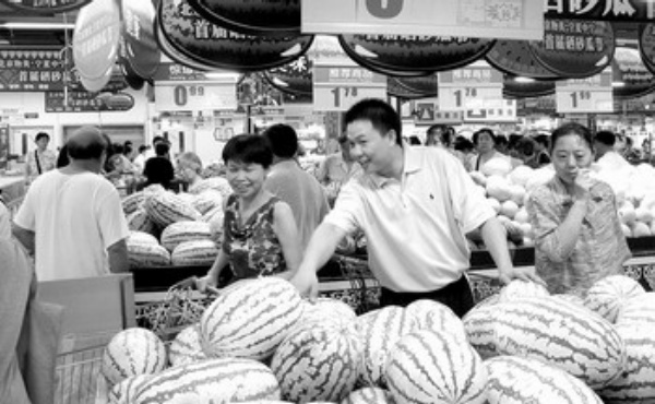 图1:新鲜实惠的宁夏西瓜为物美超市招徕了大量顾客,图为超市工作人员热心地帮顾客挑选西瓜。