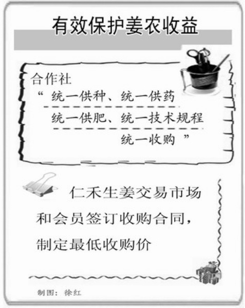 “这样,能够提高和保障生姜生产环节的质量,我们是为了长远发展才这样做的。”戴佩良介绍说,仁禾生姜交易市场的合作社和当地的合作社紧密结合,聘请高水平专业技术人员,统一供种,统一供药,统一供肥,统一技术规程,统一收购,将生产标准和储藏标准都提升了。同时,公司还和会员签订收购合同,制定最低收购价,保护会员的利益。如果市场价格高于最低保护价,则按市场价格收购,确保姜农受益。