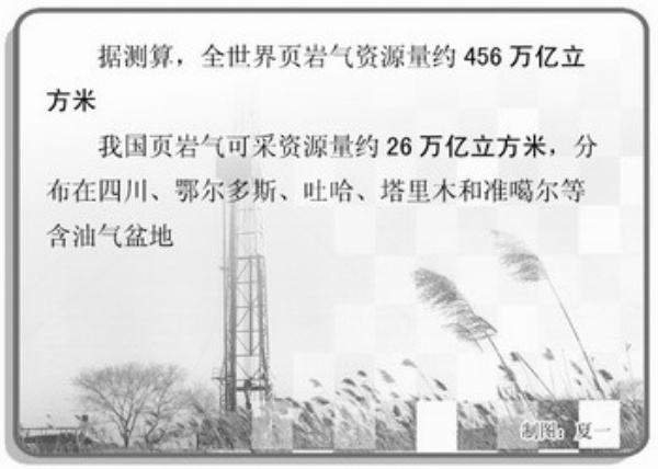 据测算,全世界页岩气资源量约为456万亿立方米,我国页岩气可采资源量约26万亿立方米,页岩气一旦突破形成产能,必将对缓解中国油气资源紧张的压力产生重大而深远的影响